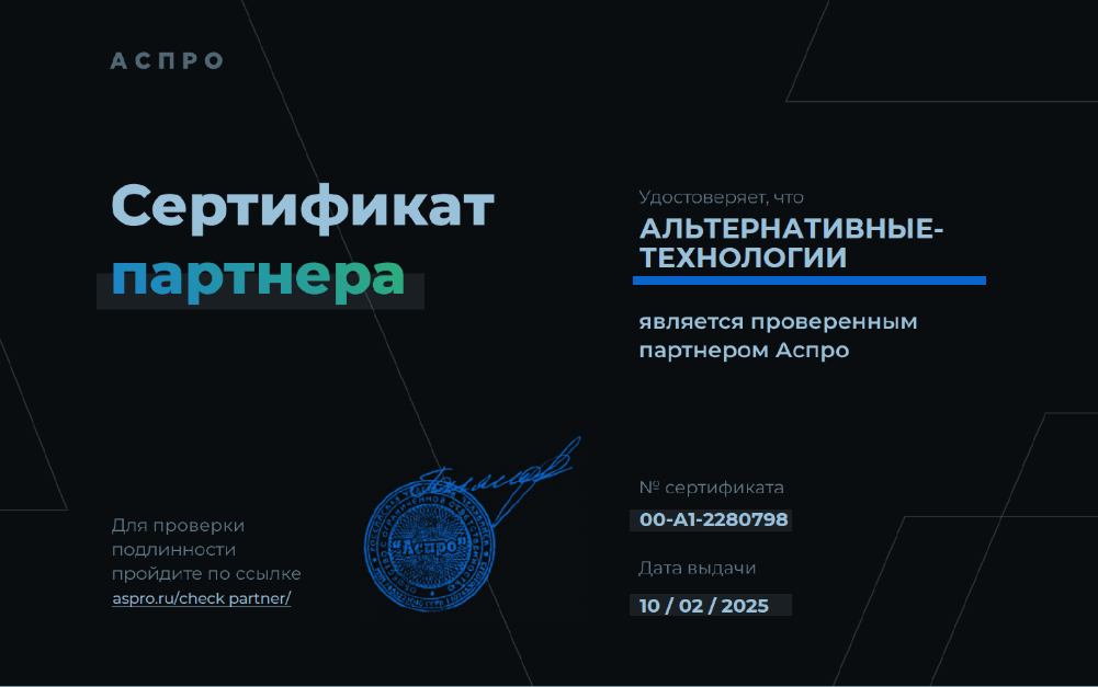АЛЬТЕРНАТИВНЫЕ-ТЕХНОЛОГИИ - сертифицированный партнёр компании АСПРО